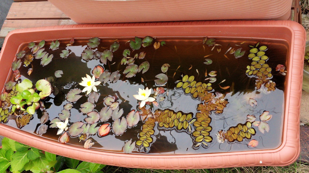 プランターで作る池はけっこう簡単ですから、おすすめですよ。 あらかじめ作っておくと、魚の入れ場所に困りませんから。