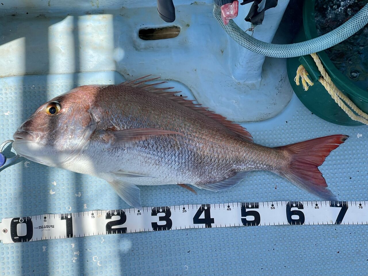 ベタ底だったのでサメかと思いましたが、あがってきたのは70cmの真鯛でした。